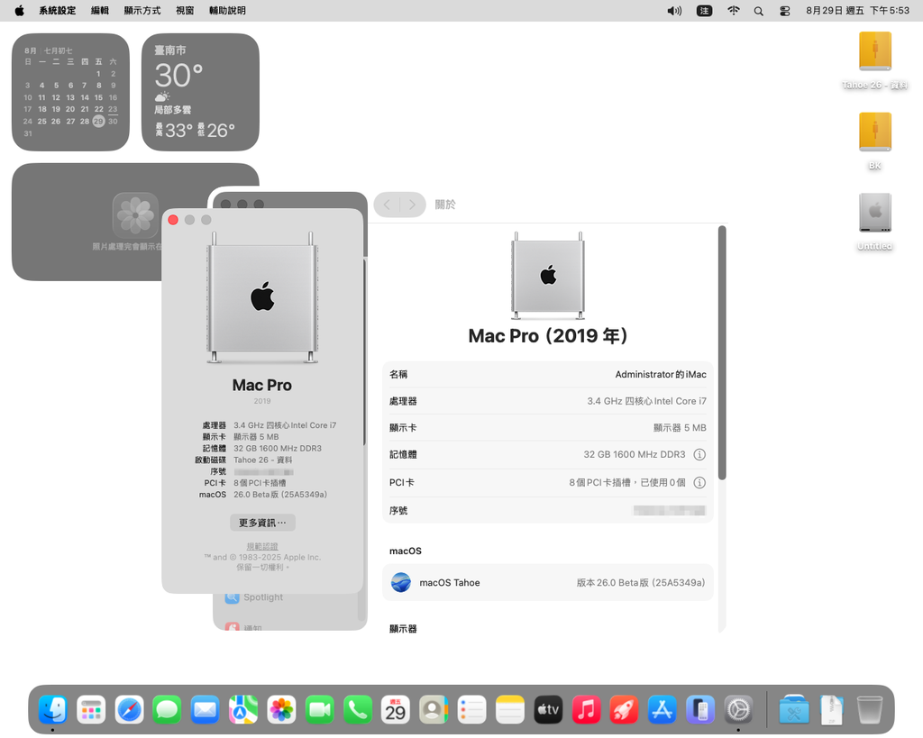 按照往例,發表會結束後,蘋果公司也一併釋出 macOS 26 Developer Beta 版,安裝方式應該是大同小異。由於是 Beta 版,所以安裝步驟簡單帶過,參考先前的文章即可。理所當然先拿三號機嚐鮮,硬體配置概述如下(應該是最後一次提及配置了):