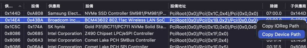 (5) 使用 Hackintool 找出本機上 FullMac 無線網卡的路徑。