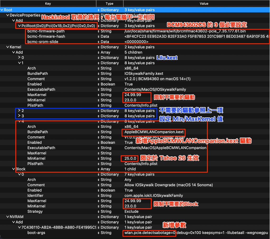 - AMFIPass.kext 與 BCM94360 的相關驅動必須拿掉,這些目前都還不支援 macOS Tahoe 26,強行掛載會導致 kernel panic,必須等將來 OCLP 大神來修正。