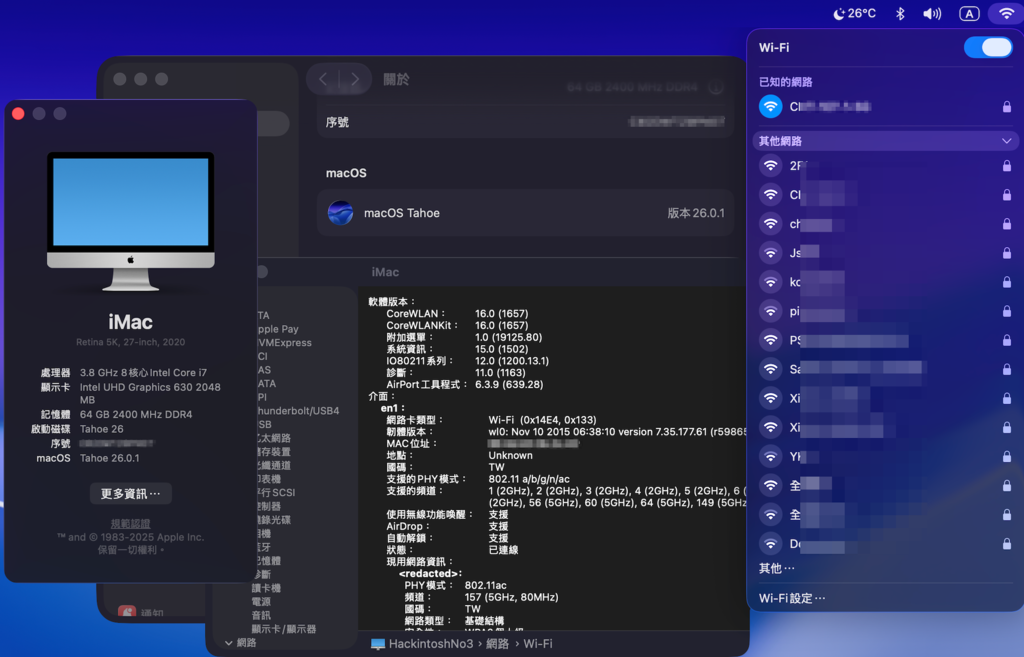 確認網卡工作正常之後,後續在 Tahoe 26.0.1 上實測有效。以下是此方案的重點說明和操作步驟,詳情可以參考方案的 Github 網頁說明文件。